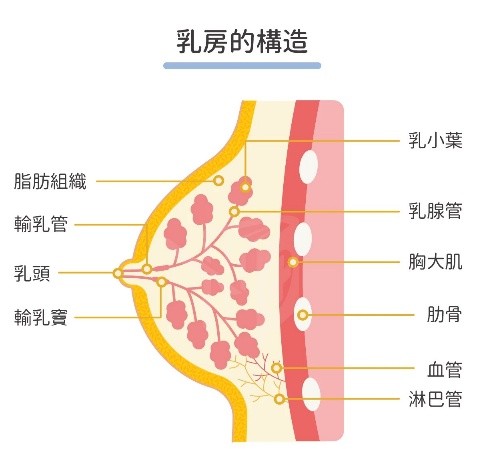 乳房內有多塊乳葉,並有一連串的乳腺,從乳葉伸展至乳頭。